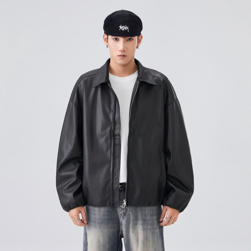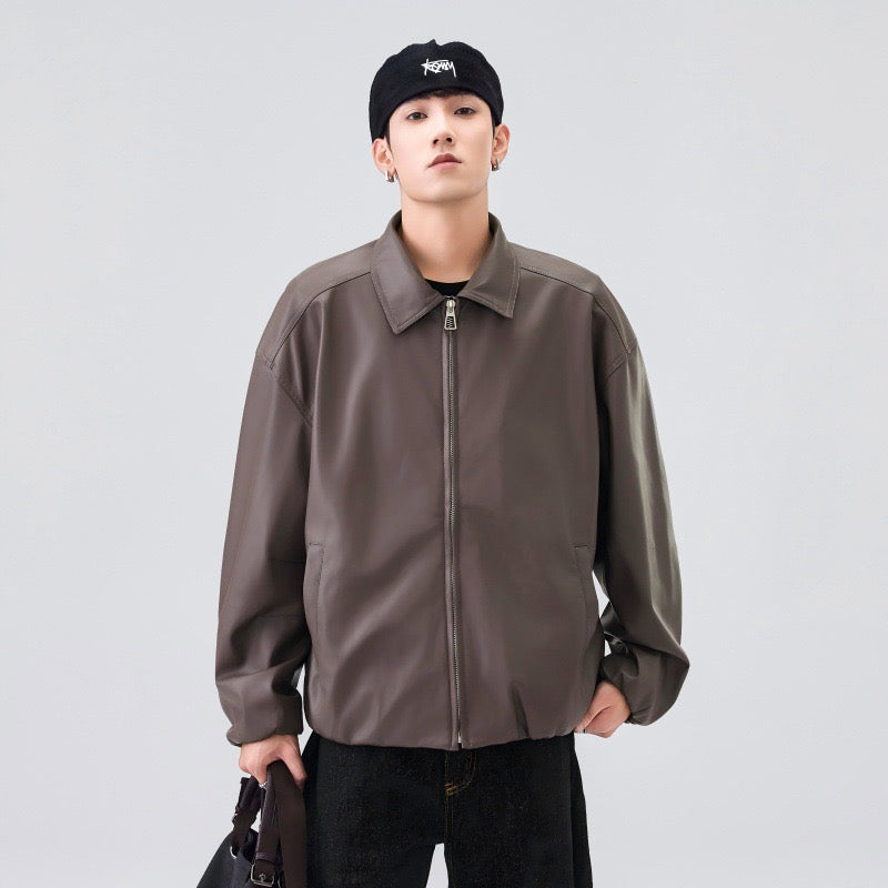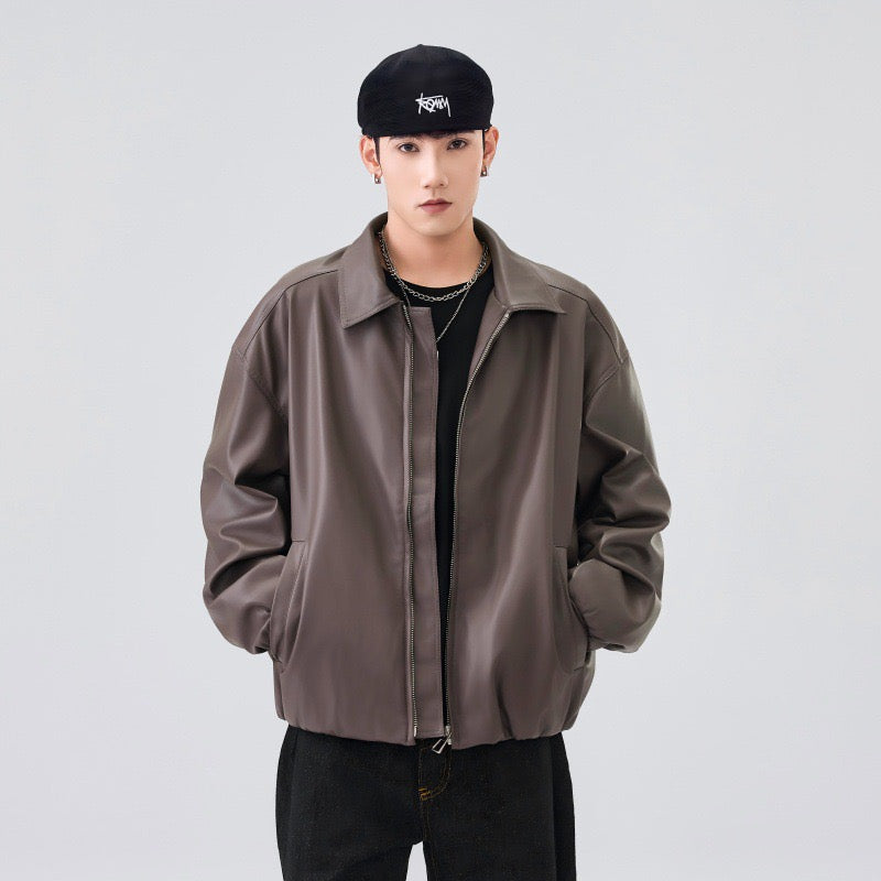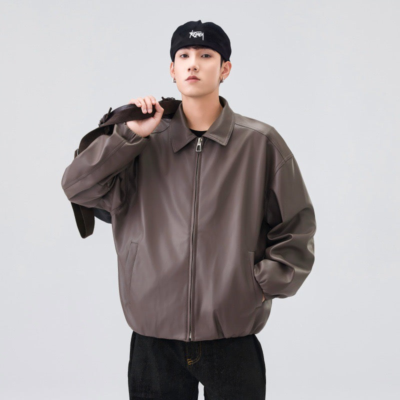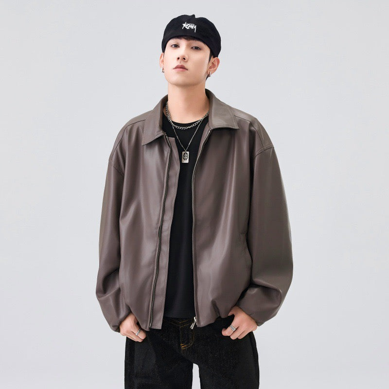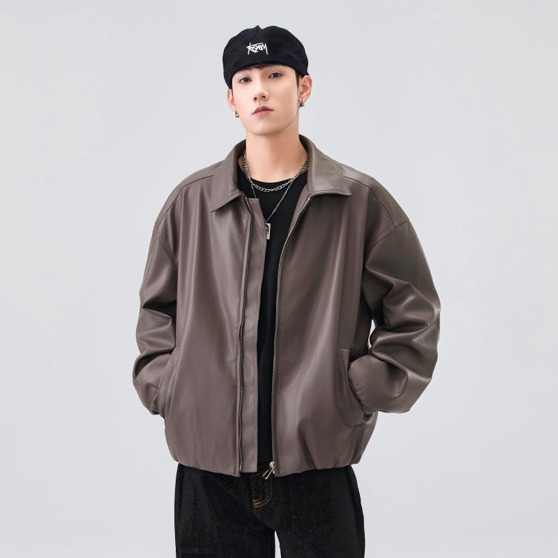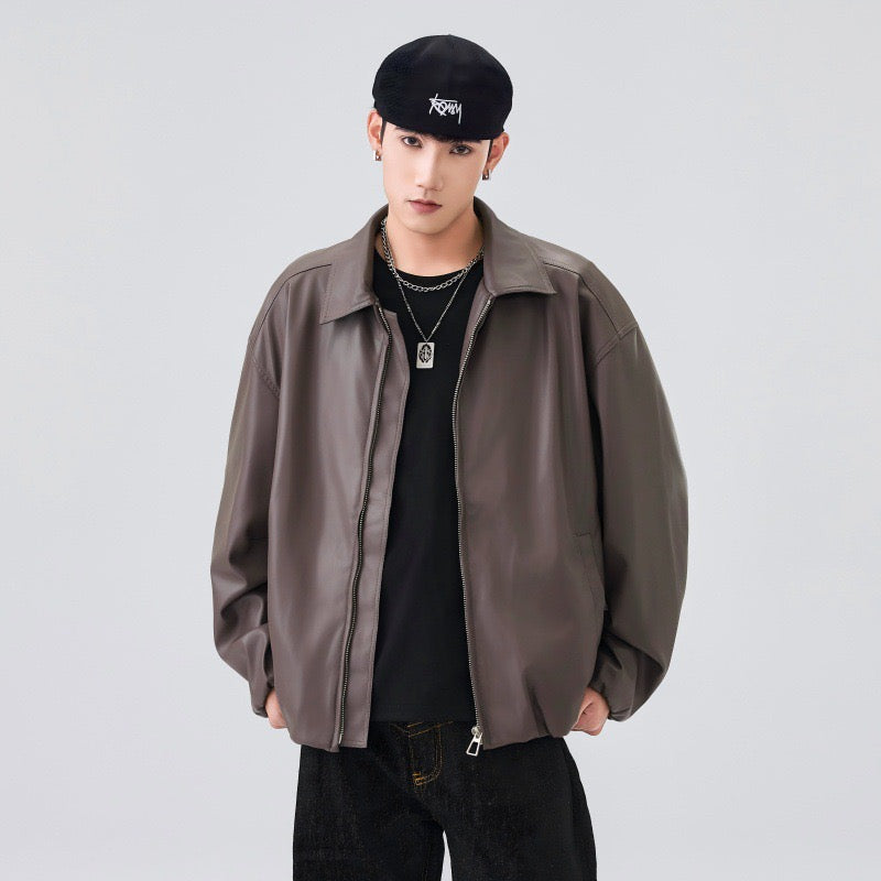 Maillard' Café Brown Vegan Leather Jacket | Retro Unisex Biker Coat with Dropped Shoulder